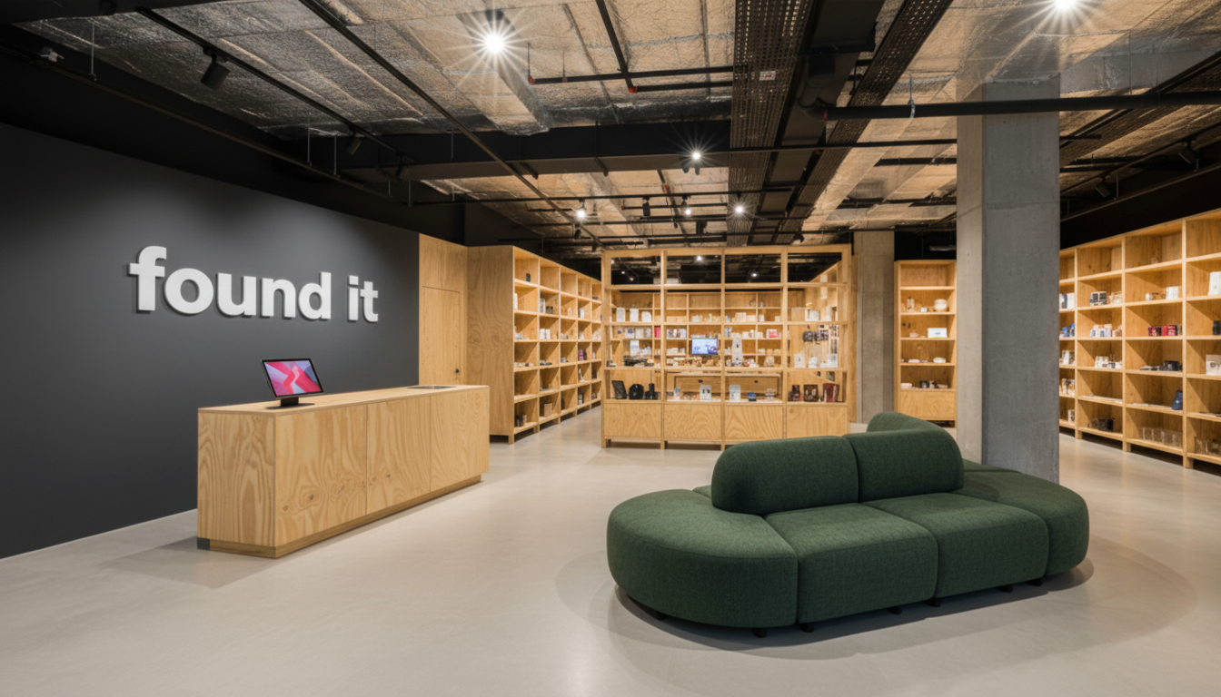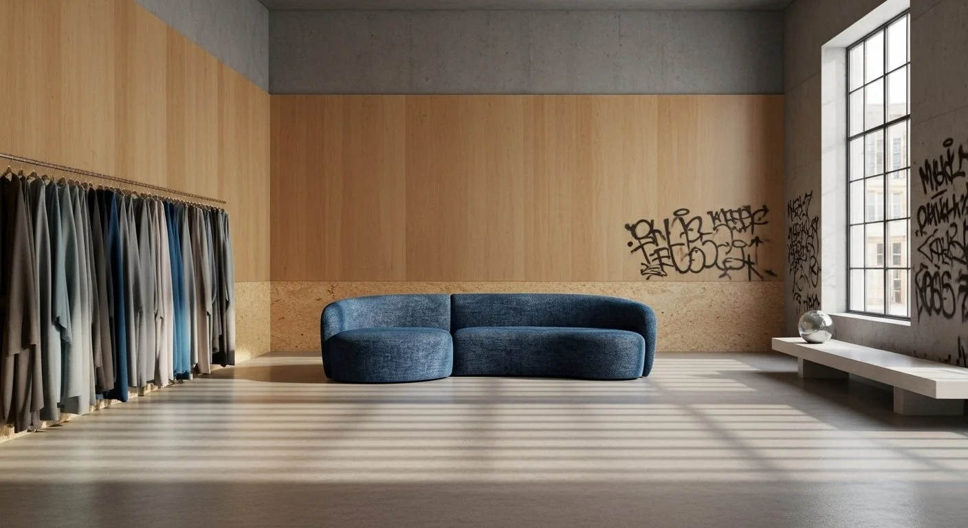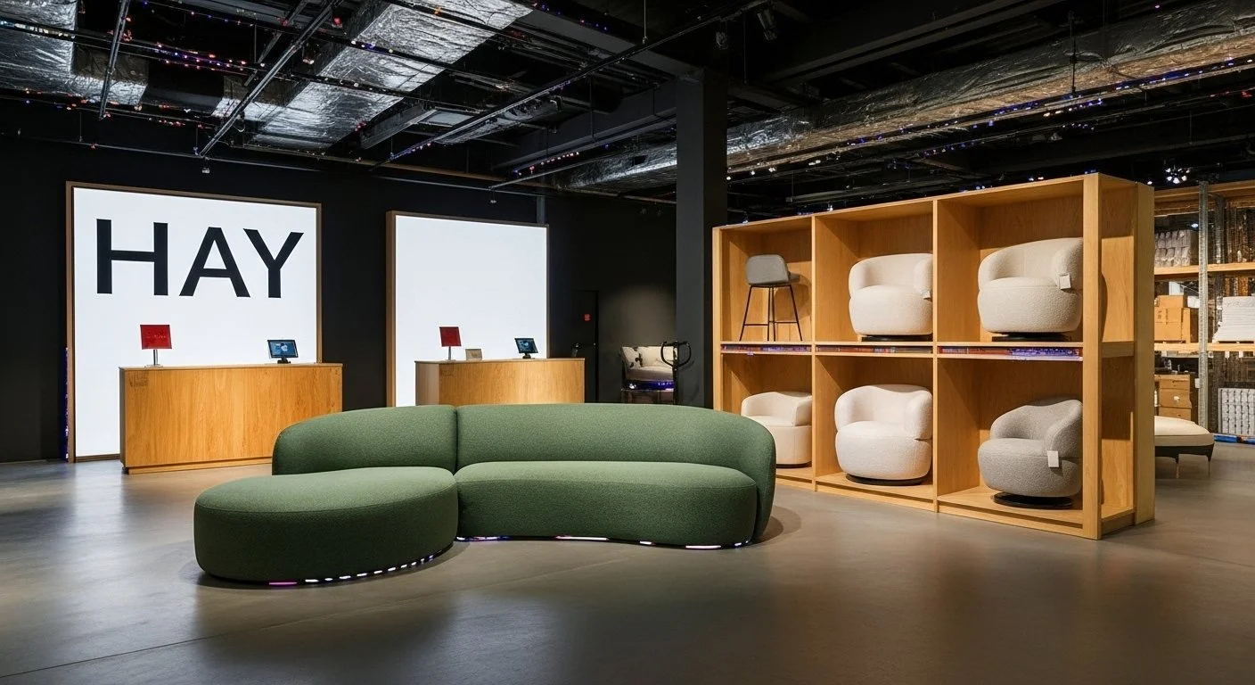 • Aesthetic Integration: To validate the factory-direct ethos, the system embedded authenticity by transforming the physical warehouse infrastructure into a deliberate design element. The “Industrial Studio” concept featured chipboard/timber walls and industrial objects to reflect the retail space, linking raw material context to the final products.